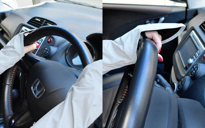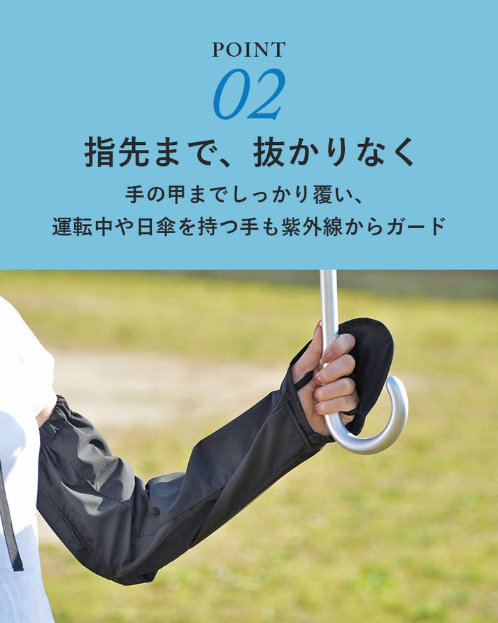 手の甲までしっかり覆う設計で、日常の動作中も紫外線対策を意識せずに続けられます。ハンドルを握る運転中や、日傘・ベビーカーを押す場面など、太陽に向きやすい手元もしっかりカバー。