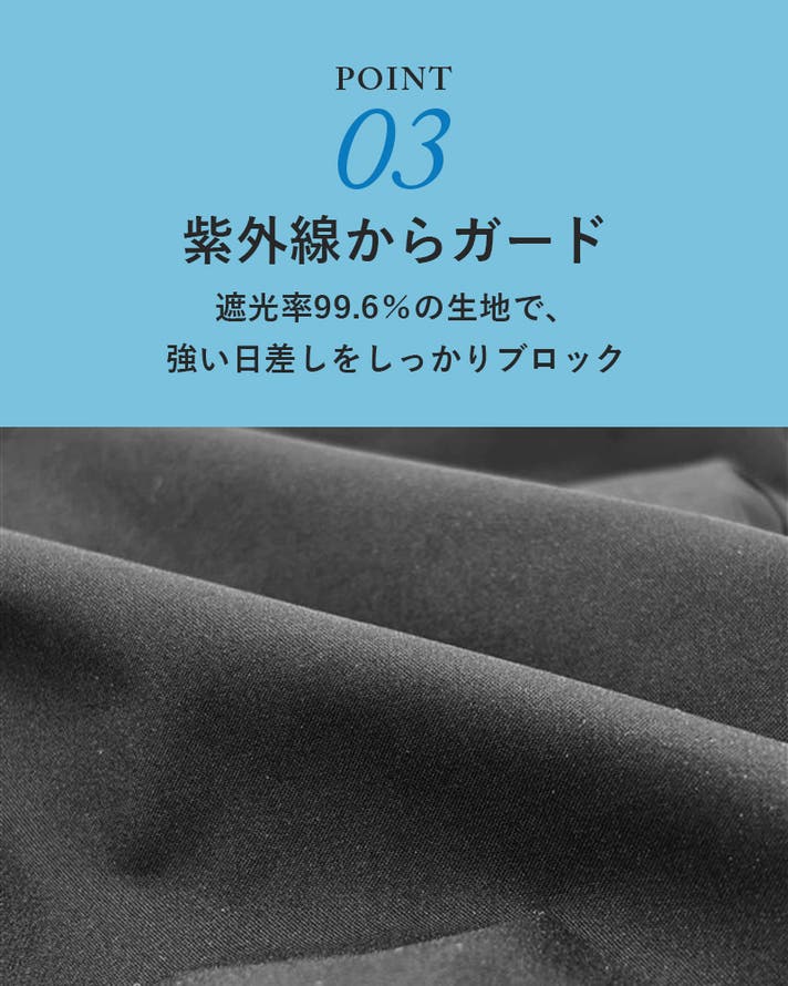 一級遮光の生地を採用し、強い日差しをしっかりブロック。直射光を遮ることで、腕に当たる光の刺激を抑え、屋外でも快適に使えます。日常の外出はもちろん、運転やレジャーなど長時間日差しを浴びやすい場面でも、安定した使い心地をサポートします。