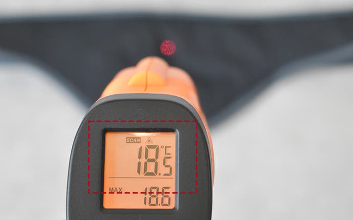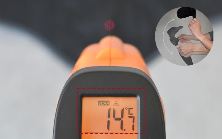 比較画像からも分かる通り「濡らして、振る」ことで最大限にヒンヤリ感が発揮されます。通常時18.5℃だったネッククーラーの表面温度は、水で濡らしただけでも16.5℃までクールダウン。さらに数回「振る」という簡単な動作を加えることで、14.7℃まで低下しました。