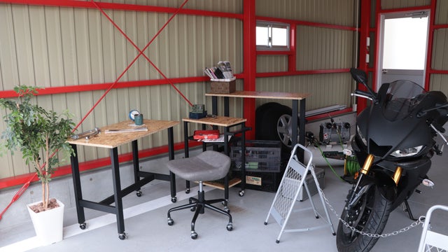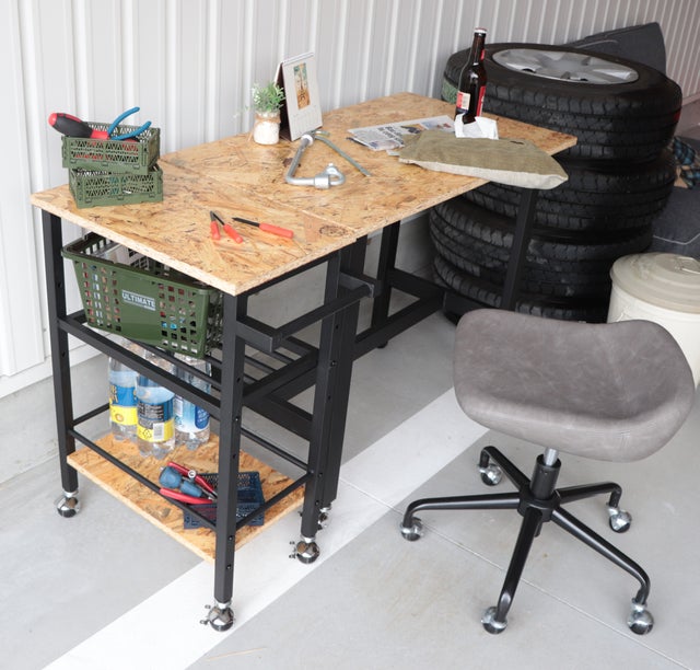 ↑見た目におしゃれでガシガシ使えるOSB天板はガレージでの使用におすすめ!