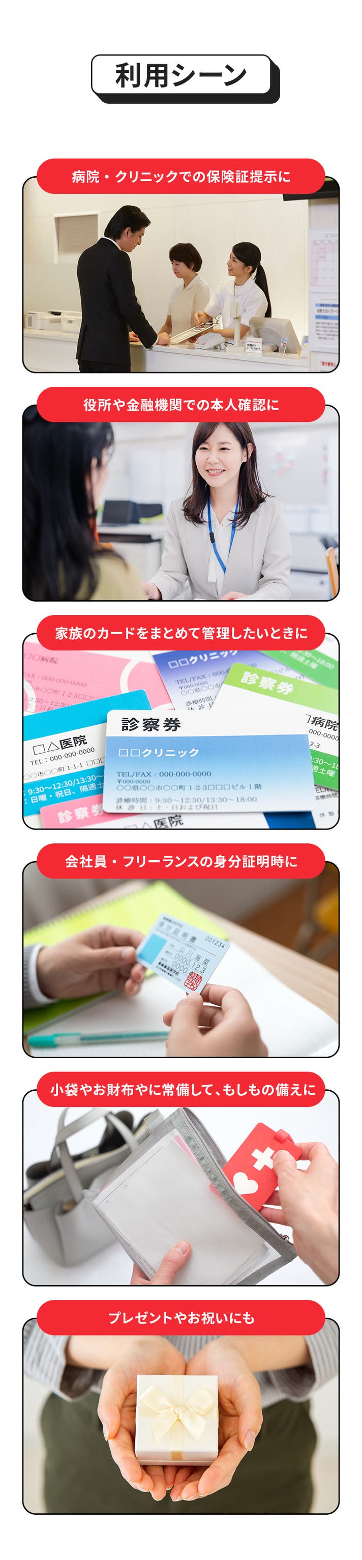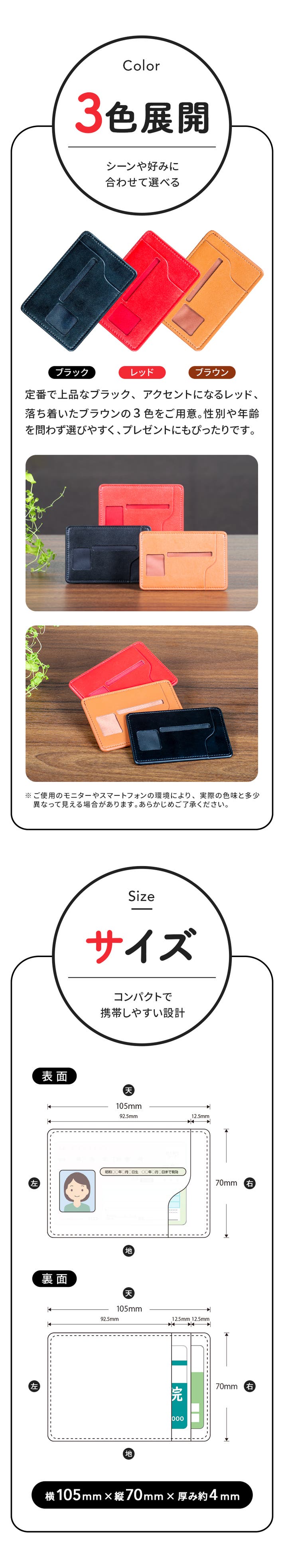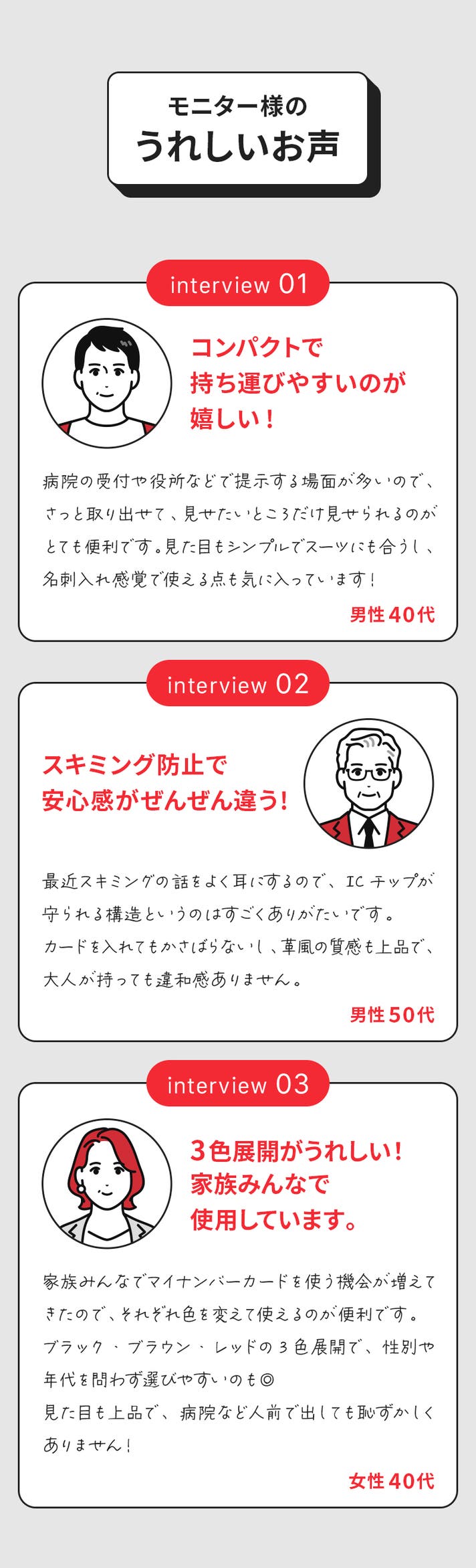 病院の受付や役所などで提示する場面が多いので、 さっと取り出せて、見せたいところだけ見せられるのが とても便利です。見た目もシンプルでスーツにも合うし、 名刺入れ感覚で使える点も気に入っています!(男性40代)
