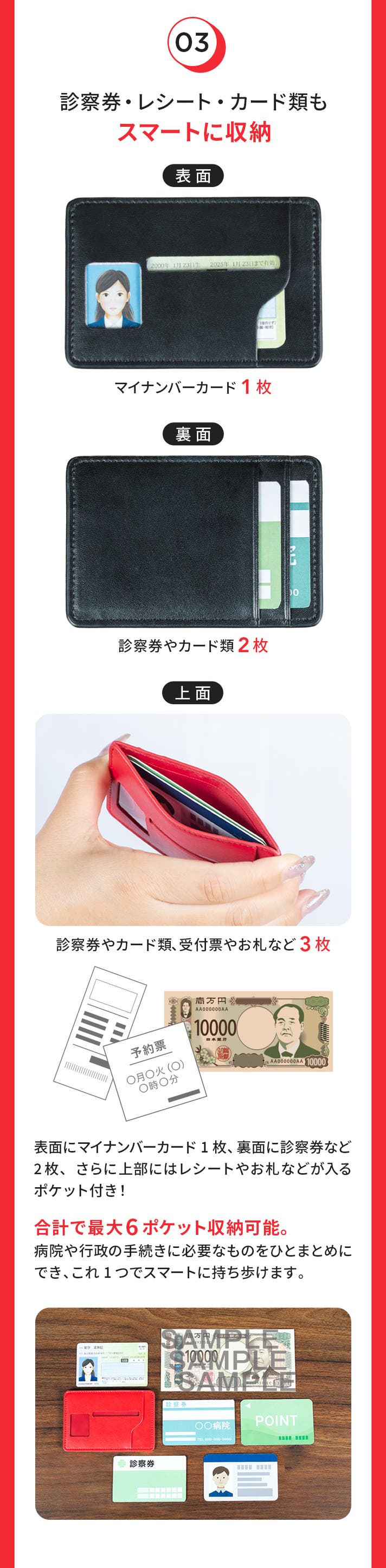 表面にマイナンバーカード1枚、裏面に診察券など2枚、さらに上部からレシートやお札などが入る設計となっております。