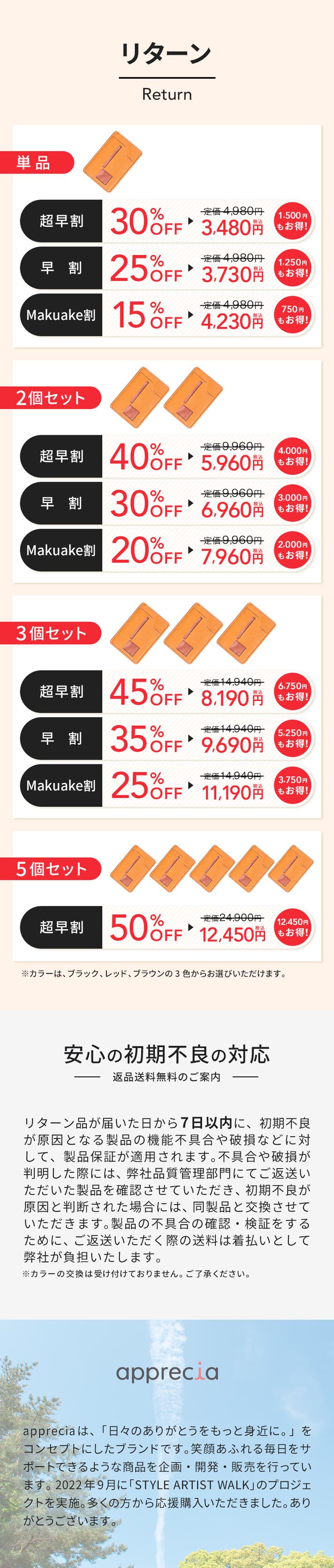 ※開発中の製品につきましては、デザイン・仕様が一部変更になる可能性もございます。 ※本文中に記載させていただいたスケジュールは、あくまでプロジェクト公開時点の予定です。応援購入の性質上、使用部材の供給状況、製造工程上の都合等により配送遅延の可能性もございます。原則として、配送遅延に伴う応援購入のキャンセルはできませんが、リターン配送予定月から3ヵ月を超えた場合には、希望者に限りキャンセルにて対応させていただきます。 ※本プロジェクトを通して想定を上回る皆様から応援購入を頂き、現在進めている環境から量産体制を更に整えることができた場合、正規販売価格が販売予定価格より下がる可能性もございます ※一部国内に類似品が出回っている可能性がございます。弊社では他社の類似品に関してのお問い合わせには対応できませんので、ご了承ください。弊社商品のオリジナル性については、上記プロジェクトに関する情報をご覧ください。 対応条件:原則として、サポーター都合によるキャンセル・返金は承っておりません。 商品の初期不良、またはお届けした商品がご注文内容と異なる場合、到着後7日以内にプロジェクトページの「実行者にメッセージ」よりご連絡ください。状況を確認の上、返金対応、または良品との交換対応をさせていただきます。 返金額: リターン金額(税込)の全額 返品送料/再送料: 商品到着7日以内の返品送料、再送料当社負担 【返品・交換をお受けできない商品】 ・サポーターの責任により破損、汚損が生じた商品 ・商品のタグ、付属品、パッケージ(箱、袋など)を紛失、破棄された商品 ・事前にご連絡をいただいていない商品 ・商品到着後、7日以上経過した商品 【交換をお受けできないケース】 ・限定品や同一商品の在庫がない場合など、代替品をご用意できない商品