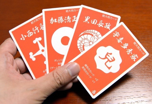 赤いカードはロールカードです。加藤清正や小西行長など秀吉軍団の中核を担う武将たちを演じてください。ロールカードの種類は全部で9種類あります。