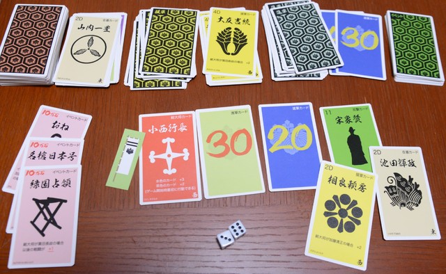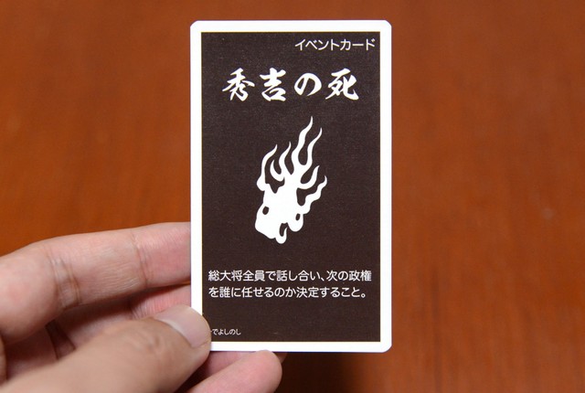 このゲームでは、豊臣秀吉という天下人の影響力の大きさを表現するために、「秀吉の死」というカードを作りました。このカードが出ると、ゲームルールが大きく変わり、「関ヶ原の戦い」が勃発します。
