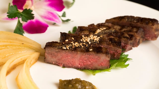 弊店では2011 年より「松坂牛のフィレ肉」を仕入れてきましたが、最近では「血がしたたる」ようなステーキが敬遠され、ミディアム仕上げに合う脂質弱めの黒毛和牛を使用しています。