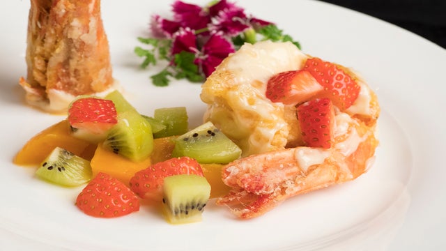 ソースは、マヨネーズ(卵黄と酢)ベースとシンプルですが、そこに大ぶりにカットしたフルーツをたっぷりと載せてお出ししています。歯と顎に自信がある方ならば殻もすべて食べられます。また、頭の裏側にナイフを入れてミソの部分をご賞味されてみてください。心地よい食感と爽やかな旨味をご堪能して頂けるはずです。