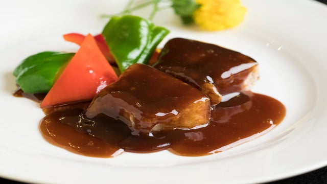女性に人気のコラーゲンたっぷりの豚バラ肉角煮に、薄く衣を付けサッと揚げて下拵えをし、“CENTONZE” バルサミコ酢をベースにしたソースで少し甘めに仕上げます。彩りがきれいな洋野菜とパイナップルを添えてお出しいたします。