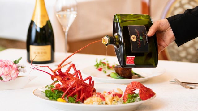 料理長特撰「9品前菜(台湾産カラスミ・特製クラゲ等)」、気仙沼産自家戻し「フカヒレ姿煮(中サイズ)」、インド洋産「天然有頭大海老のフレッシュフルーツソース仕立て」、黒毛和牛「サーロインステーキ(100g)」特製ワサビソース添え。