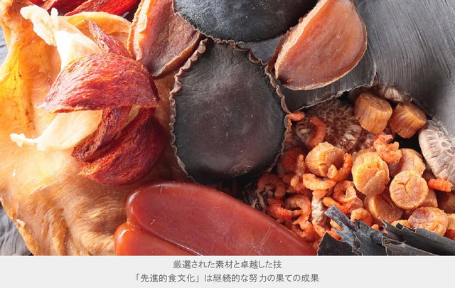 高タンパク低糖質、ビタミンD やB12、亜鉛やマグネシウムなどが豊富な滋味に溢れたフカヒレを、料理長オリジナル「上湯(出汁)」をベースに味もトロみも薄めに仕上げた香り高いソースと合わせます。最少の調味料で「食べ手の満足」を最大限に引きだす緊張感。国際的な美食家を惹きつける魅力がここにあります。