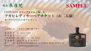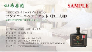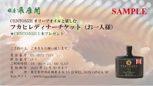 今回、飛雁閣での「ディナー&ランチコース」、「特撰お取り寄せコース料理」には特典の一つとしてCENTONZE のオリーブオイルをお付けします。