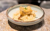 リゾットにはイタリア米を用い、松茸を大ぶりに切って加え、香りを最大限に生かすためにバターを控えめに仕上げています。バターの重さを避けることで、松茸本来の芳醇な香りが立ち上がるよう工夫しました。