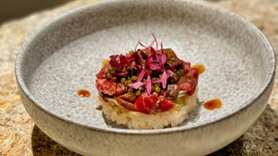 合わせる自家製コンソメは、6時間以上をかけて丁寧に煮出した澄んだ旨味の一滴。そこに北海道産の山わさびと、ピリッとした辛味を持つスプラウトを添えることで、上品な赤身の旨味に爽やかな変化を加えています。