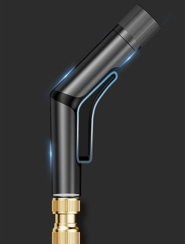 自動加圧構造とは、水流が伸縮性が高いホースに流れると水にパワフルを与え、次に無抵抗のホース内を通過しながらさらに水圧が増え、最後にノズル内部にあるタービンの旋回運動でさらに水流を加速させます。その結果、ジェット水流として噴射されることができます。
