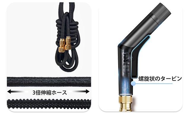 ホースは水流が流れると3倍の長さに伸び、使用後は元の長さに戻る構造のため、収納時にかさばりません。