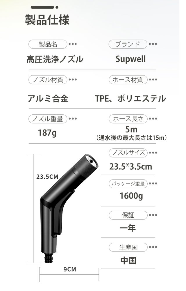 Supwell高圧洗浄ノズルなら電源不要で、自動加圧構造より家庭水道水をパワフルに、頑固な汚れも楽々除去。操作は簡単、トリガーボタンを押すだけで放水と止水を自在にコントロール!