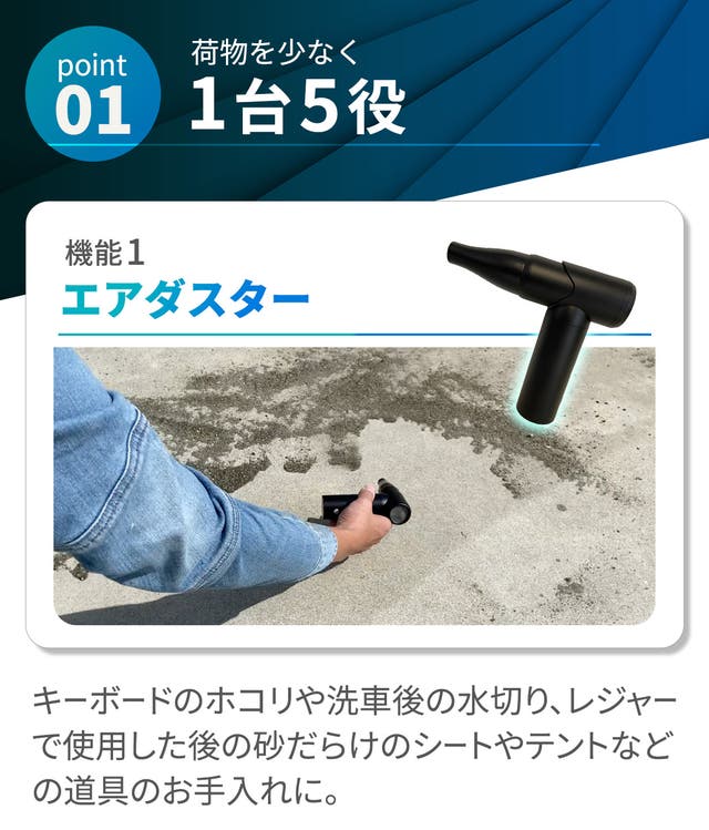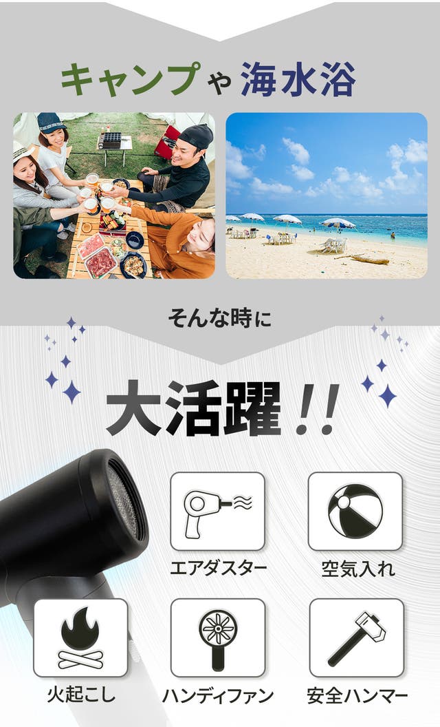 - 【1台5役】掃除だけじゃない!空気入れや洗車時の水切り、火起こし、安全ハンマーとしても