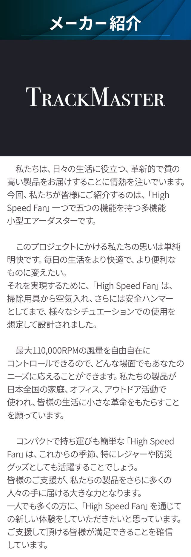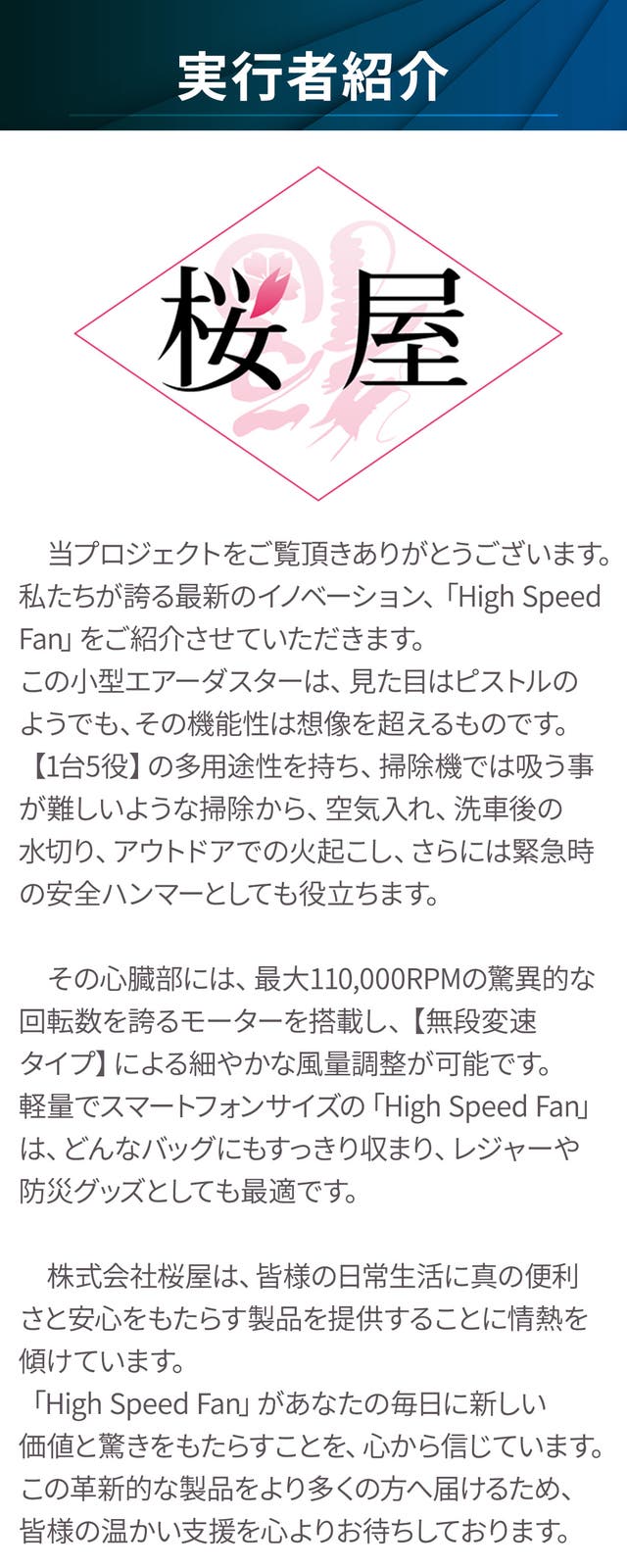 ※リターン品の配送が完了するまで、株式会社桜屋 は High Speed Fan の日本における独占販売権を有する正規代理店です。詳細に関しては、ページ下部のリスク&チャレンジをご確認ください。