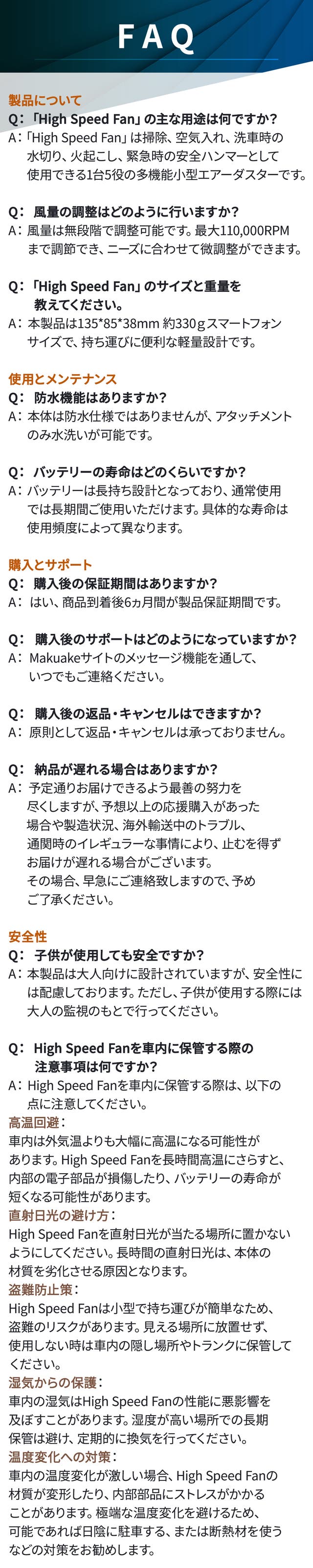 【出荷遅延】予定通りお届けできるよう迅速且つ丁寧に最善の努力を致しますが、予想以上の応援購入があった場合や製造状況、海外輸送中のトラブル、通関時のイレギュラーな事情により、止むを得ずお届けが遅れる場合がございます。早急にご連絡致しますので、予めご了承ください。 【並行輸入品】リターン品の配送が完了するまで、株式会社桜屋はHigh Speed Fanの日本における独占販売権を有する正規代理店です。しかしながら、並行輸入品が発生する可能性がございます。並行輸入品は正規代理店のサポートを受けることができない、また関税の適切な処理などが担保されませんので、お気をつけください。 【類似品】一部国内に類似商品が出回っている場合がございます。弊社では他社の類似品に関してのお問い合わせには対応できませんのでご了承ください。 【スケジュール】本文中に記載させていただいたスケジュールは、あくまでプロジェクト公開時点の予定です。応援購入の性質上、配送遅延のおそれがございます。原則として、配送遅延に伴う応援購入のキャンセルはできませんが、リターン配送予定月から3ヶ月を超えた場合には、希望者に限りキャンセルに対応させていただきます。 【返品・交換】お届けから6ヶ月間以内に確認された不具合(破損、汚れ、欠品等)は、未使用の場合に限り、直ちに代替品をお届けいたします。(送料は弊社負担)但し、お客様都合による返品、キャンセルはお受け致しかねますのでご了承ください。 【一般販売価格】想定を上回る皆様から応援購入を頂き、量産体制を更に充実させることができた場合、一般販売価格が予定価格を下回る可能性がございます。 【免責事項】本製品使用によるトラブルについては一切の責任を負いかねますので、ご了承ください。 応援購入の性質上、以上の注意点につきまして予めご理解とご了承をいただいた上で応援購入くださいますよう、何卒よろしくお願い申し上げます。 最後に、本製品を受け取られた皆様に喜んでもらえるよう、株式会社桜屋のチームメンバー一同、心を込めて対応して参りますので、 応援の程、よろしくお願い致します。