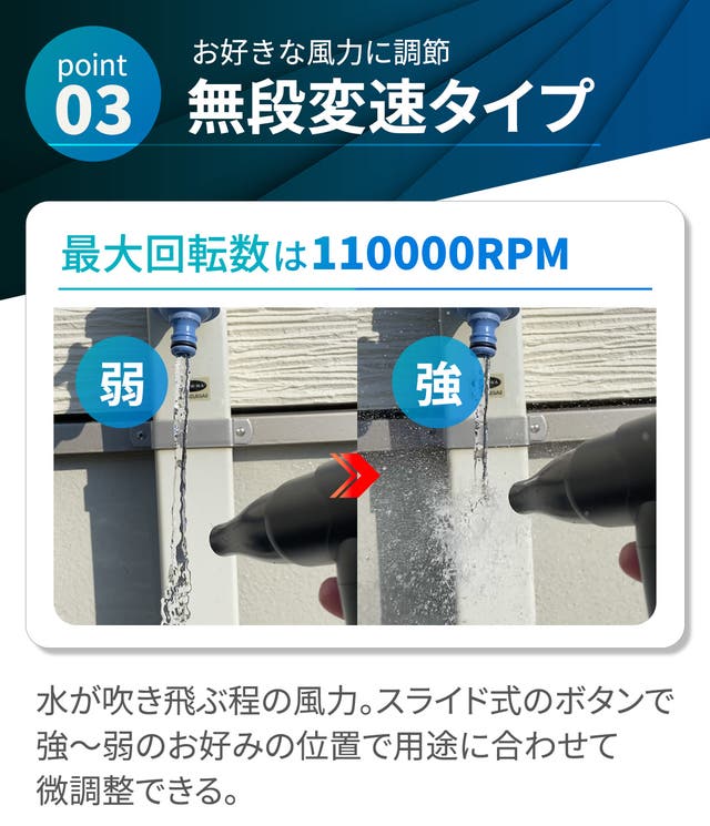 - 【無段変速タイプ】最大回転数110000RPMの強風から弱風まで微調整が可能!