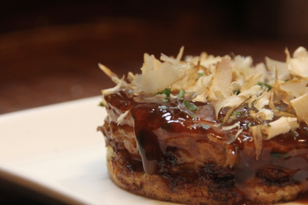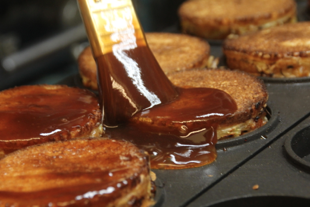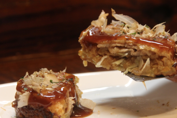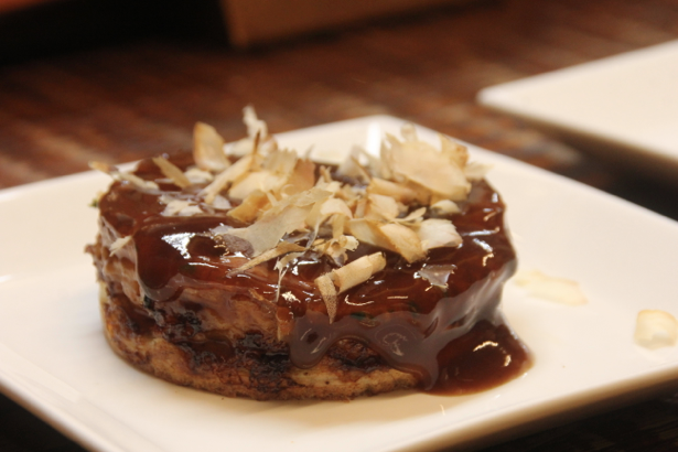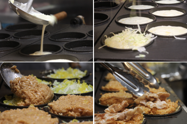 手の平サイズで見た目はただのお好み焼ですが、もちもちの生地にお箸をいれると、中には沢山の甘いざく切りキャベツ、豚肉、そして特性マヨネーズご飯がびっしり。