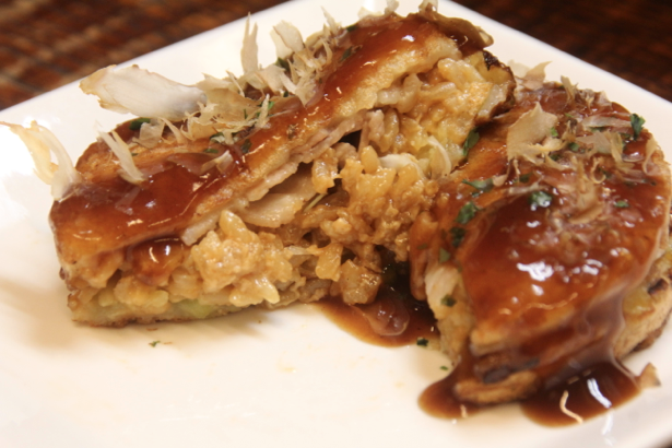 世の中にはお好み焼は沢山ありますが、ご飯入りのお好み焼は完全オリジナル。