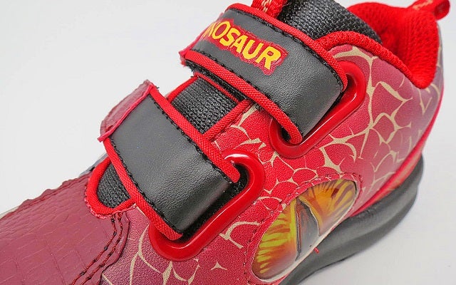 通常キッズスニーカーは、メッシュ素材などが多く使われていますが、恐竜の皮膚に近づけるためにPVCを採用!!
