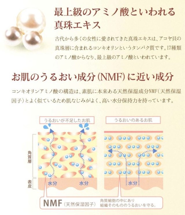 - 愛媛県産の真珠エキスは、肌のうるおい成分に近いものを使用!