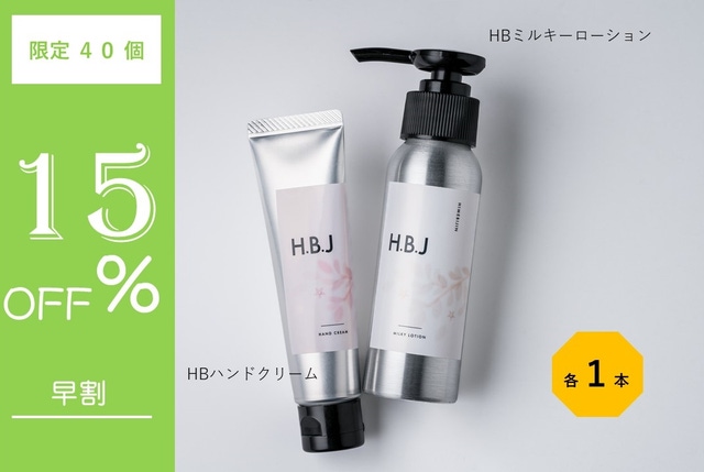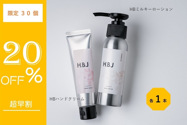 HBミルキーローション(容量80ml)×1本、HBハンドクリーム(容量30g)×1本の2本セットでお送りいたします。