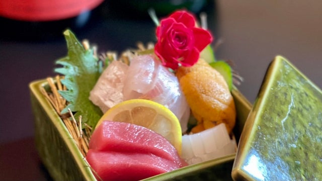 造り 本マグロ、瀬戸内のイカ、淡路産ウニ、天然の明石鯛の四種盛り