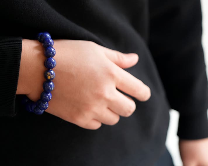 製作は、京都で30年以上念珠・数珠を手掛けてきた職人チームが担当。珠をつなぐゴムの通し方や結び目まで、すべて熟練の手仕事。素材はすべて厳選された濃い青みの高品質ラピスラズリで、金の粒(パイライト)の入り方が美しいものを選び抜いています。