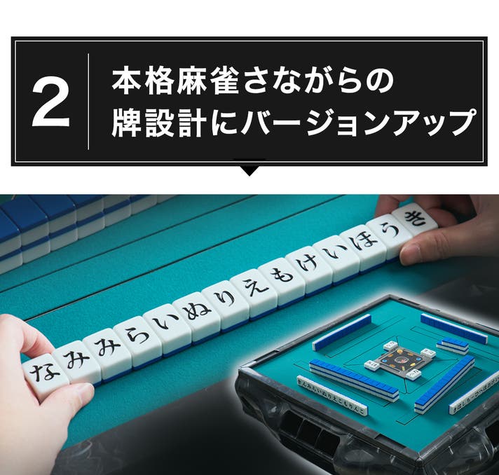 - 一般的な麻雀牌と同じ28mmサイズで自動卓にも対応。専用ケース付きで収納や持ち運びもスマートに