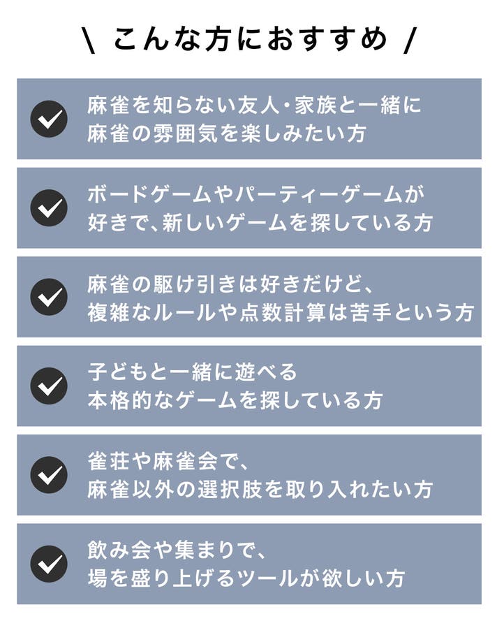 - 親やリーチ、点棒計算で競技性アップ。誰でも遊べる簡単さと本格的な駆け引きを両立した大人仕様。
