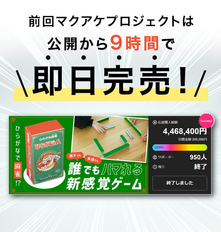 「Makuake(マクアケ)」は、実行者の想いを応援購入によって実現するアタラシイものやサービスのプラットフォームです。このページは、 プロダクトカテゴリの 「即日完売したひらがな麻雀ゲームが本格仕様にアップグレード!|ひらがじゃんプロ」プロジェクト詳細ページです。