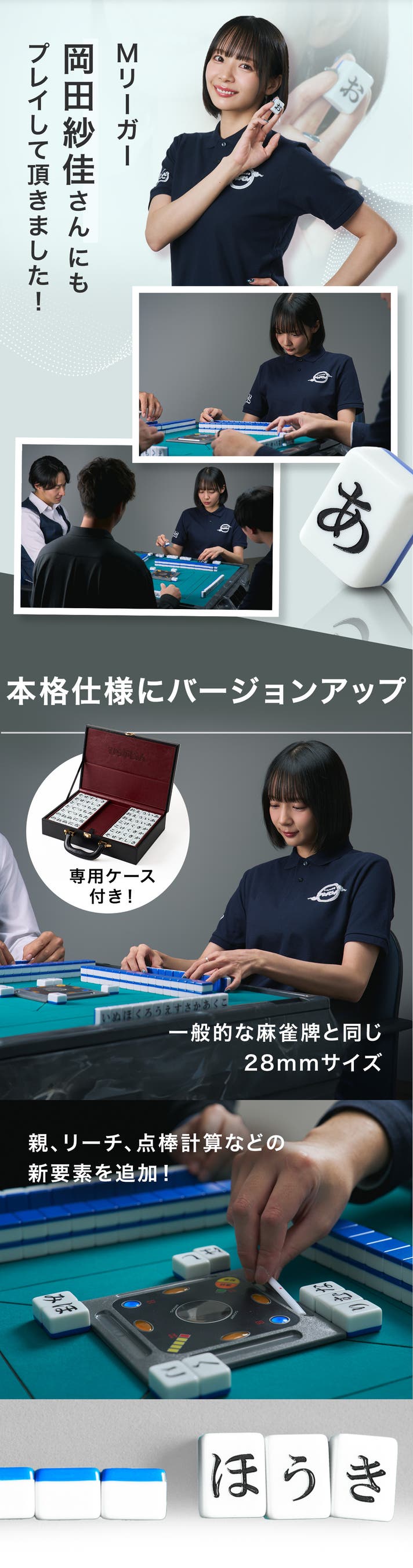 牌のデザインをより本格的な麻雀に近づけ、親・リーチ・点棒計算システムの導入で競技性を高めました。