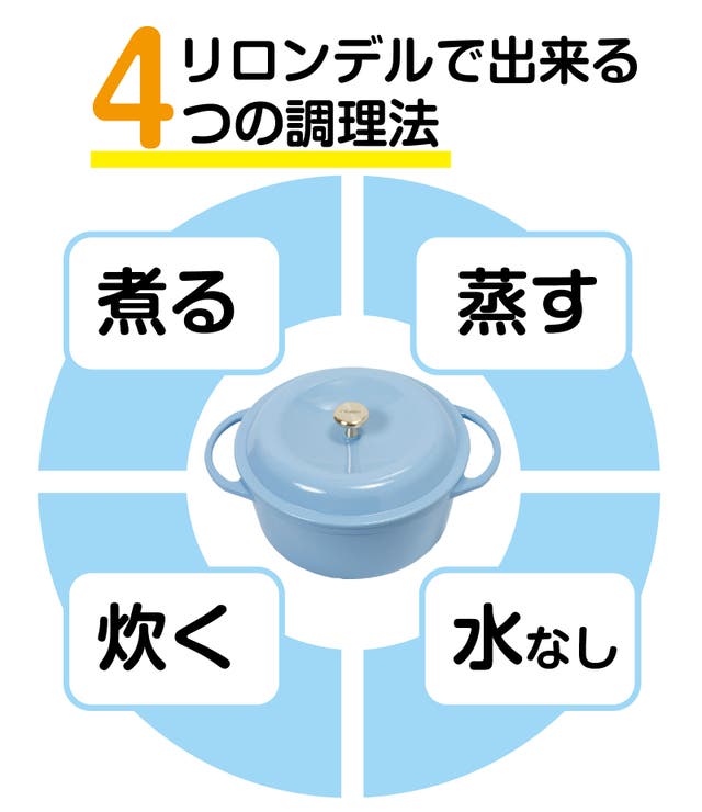 リロンデルは料理初心者にも使いやすいヒミツがあります。それは、ほったらかし調理が得意なこと。材料を入れて下調理をしたら弱火にかけておくだけで料理が完成します。※水分が極端に少ない食材の場合、水を足す必要があります。
