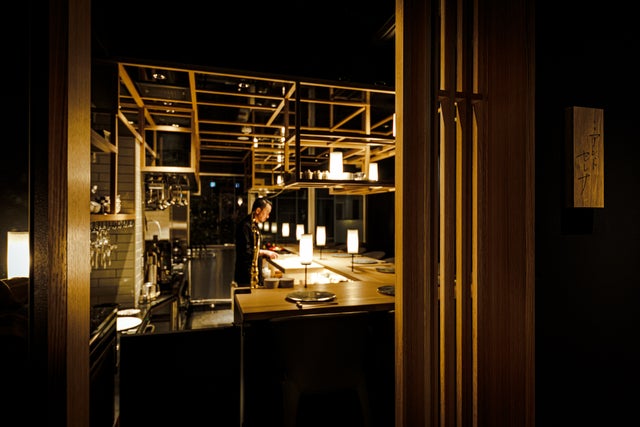複合型飲食ビルは、2階がカウンター9席のレストラン。3階はカウンター8席のバー。4階は2部屋の半個室という構成。