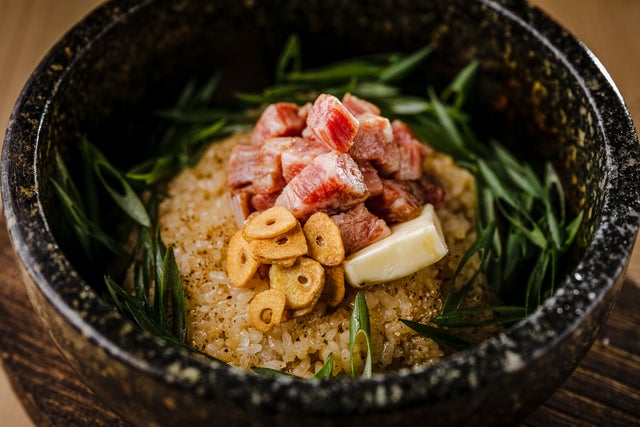 2階のレストランで楽しめるのは、ヒレユッケとキャビアのシャリシャリ冷麺、マグロのトロキャビア、フォアグラトリュフ土鍋ご飯など、和食をベースにしながら、イタリアンやフレンチなどさまざまな国の調理法を取り入れたフュージョン料理。