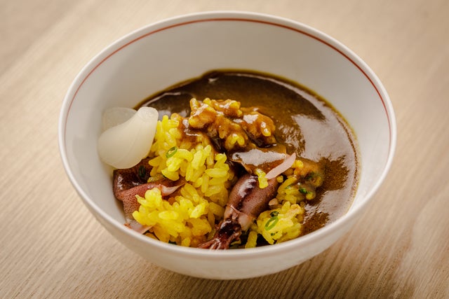 合わせだしにスパイスを絡め仕上げた特製ビーフカレーを、サフランで炊き上げたライスと合わせて食す1品は、幅広いアルコールとマッチする。