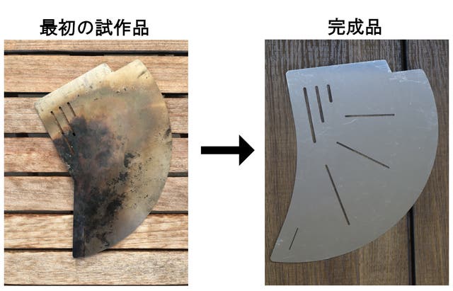 しかし、熱膨張のことばかり考えてしまったので、空気孔の本数が多過ぎて「見た目が良くない」、幅を太くし過ぎて「灰が地面に落ちてしまう」などの新たな課題が出てきました。これらの反省を踏まえて、空気孔の「本数、幅、角度、長さ」を調整し、また、ステンレス素材をSUS304から熱膨張率の低いSUS430へ変更など、改良・燃焼テストを繰り返しようやく完成品にたどり着くことができました。