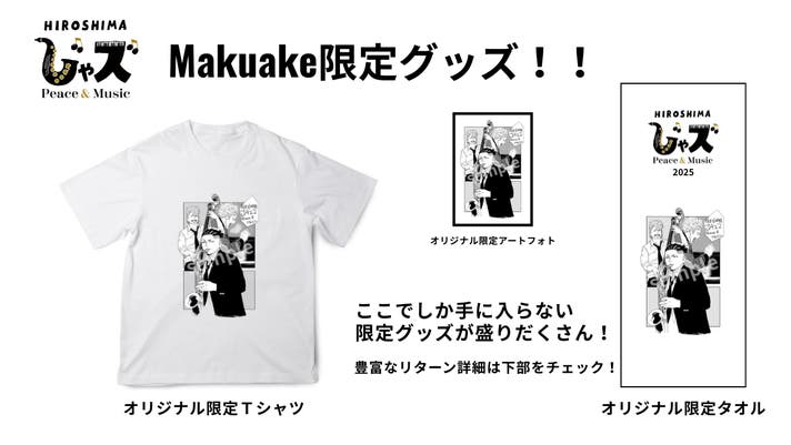 そんなミッションを叶えるべく、広島県民だけでなく、広島を愛する、音楽を愛する仲間「じゃズメン(じゃズメンバー)」たちに喜んでもらえるように、今回もMakuake限定グッズやバリエーション豊かな返礼品をご準備いたしました!