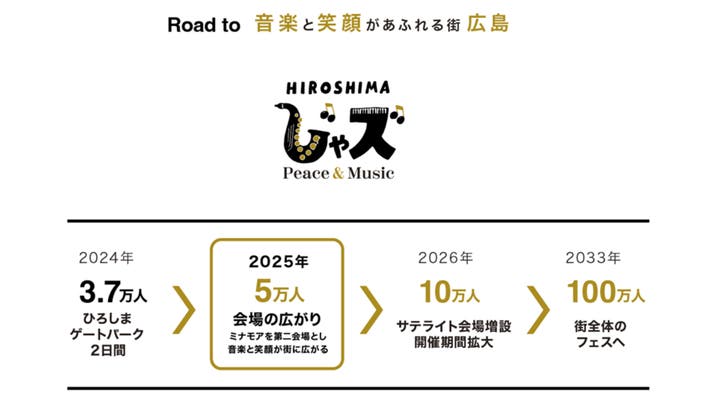 今年、被爆80年という広島にとって特別な年に、自由と多様性を象徴するジャズの精神を通して、平和のメッセージを広げるべく第2回「広島じゃズ」を開催致します。また今年は広島駅ビル「ミナモア」が会場に加わり、ゲートパークと併せて街全体が音楽に包まれ、規模も昨年の1.5倍の5万人を目指して参ります!