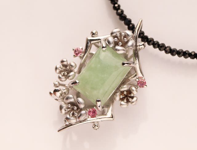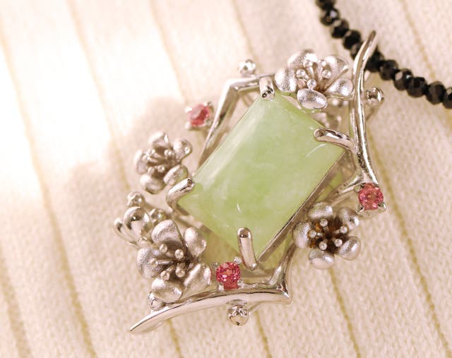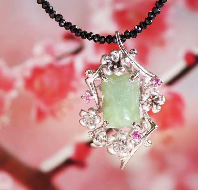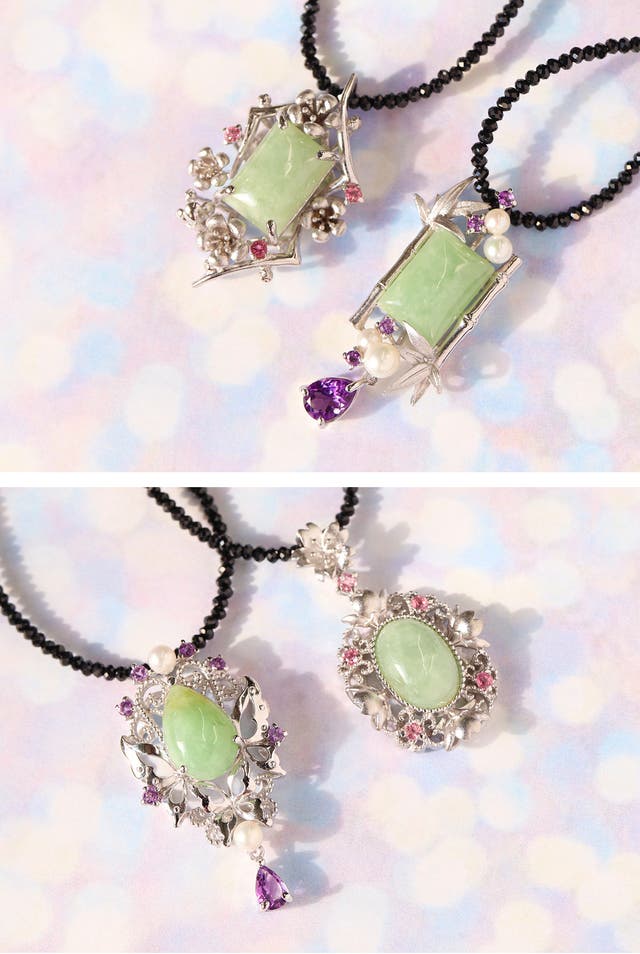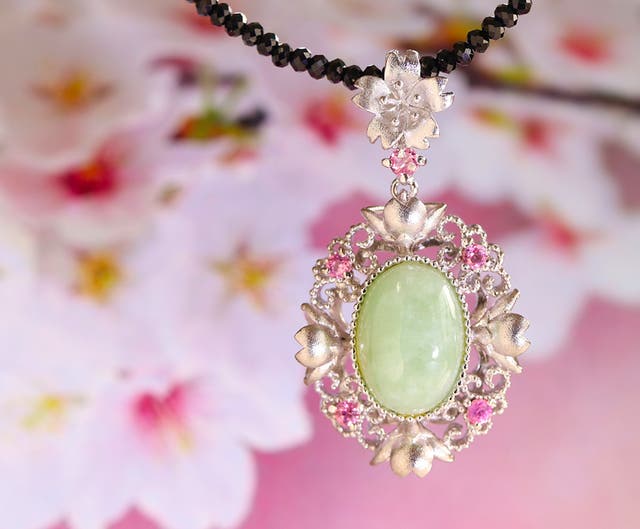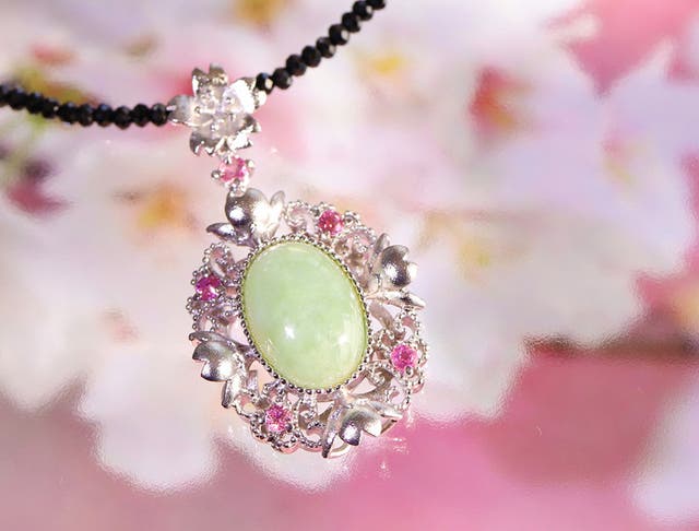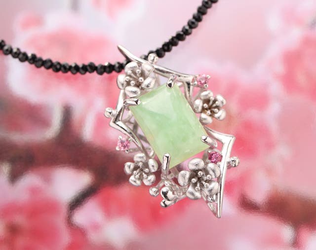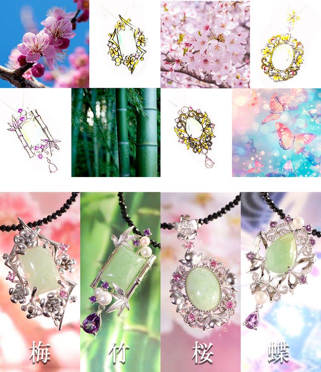 淡い緑の翡翠の宝石を中心に、日本人に愛されてきた梅、桜、竹、蝶のモチーフのネックレスをデザインしました。