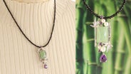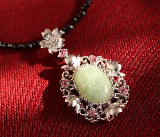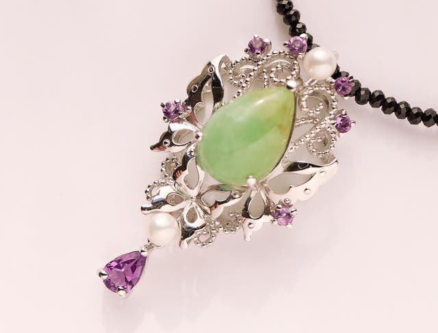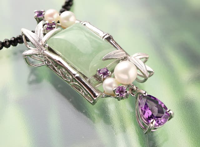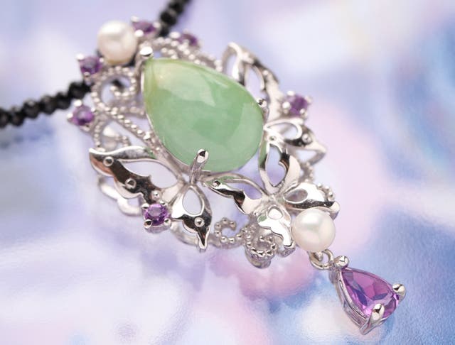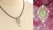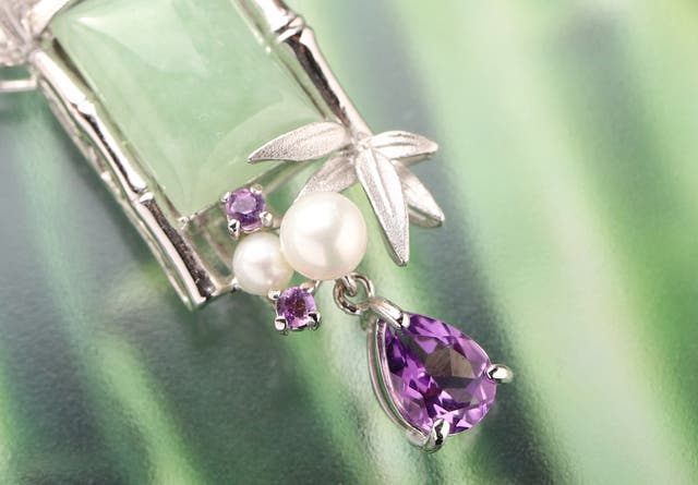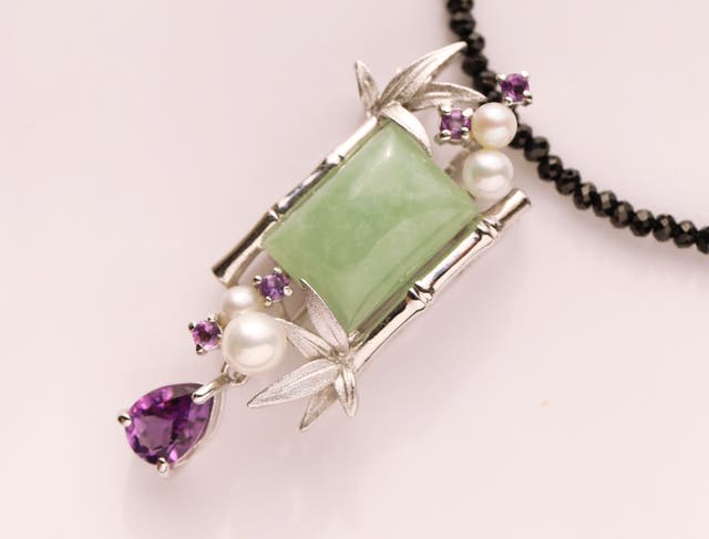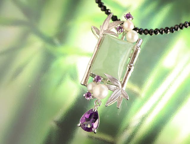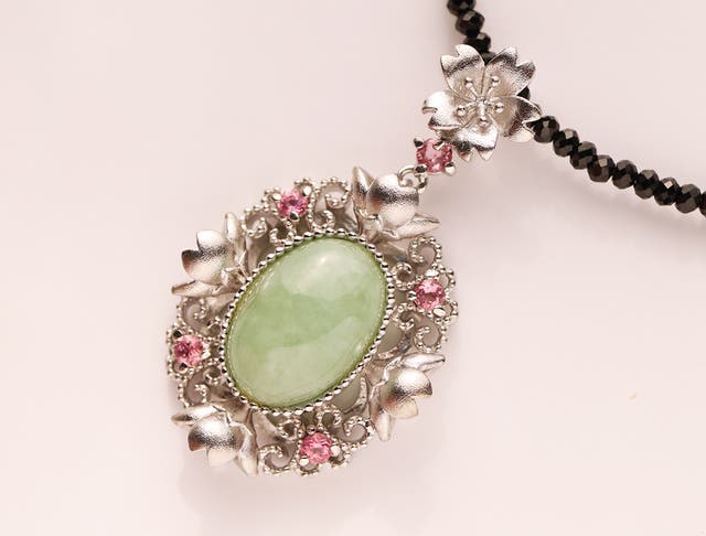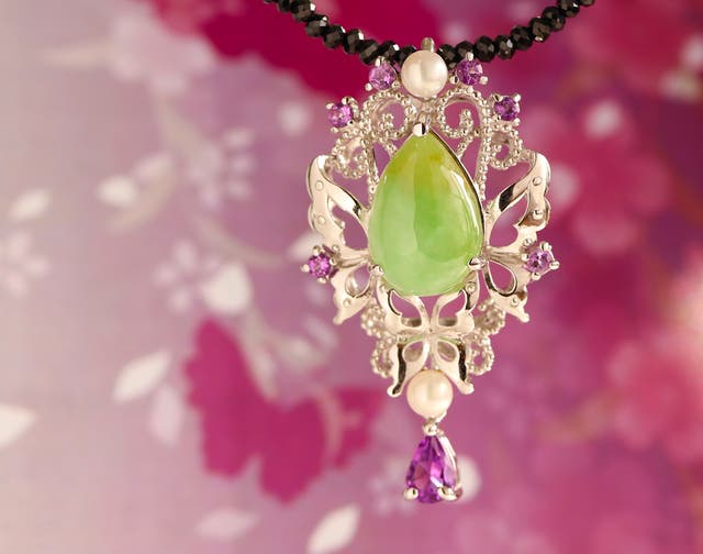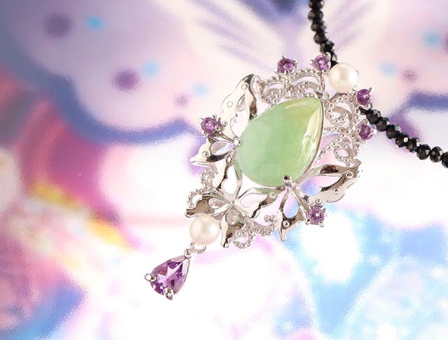 淡い緑の翡翠の宝石を中心に、日本人に愛されてきた梅、桜、竹、蝶のモチーフのネックレスをデザインしました。