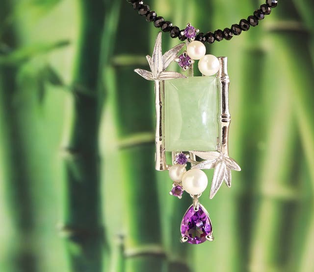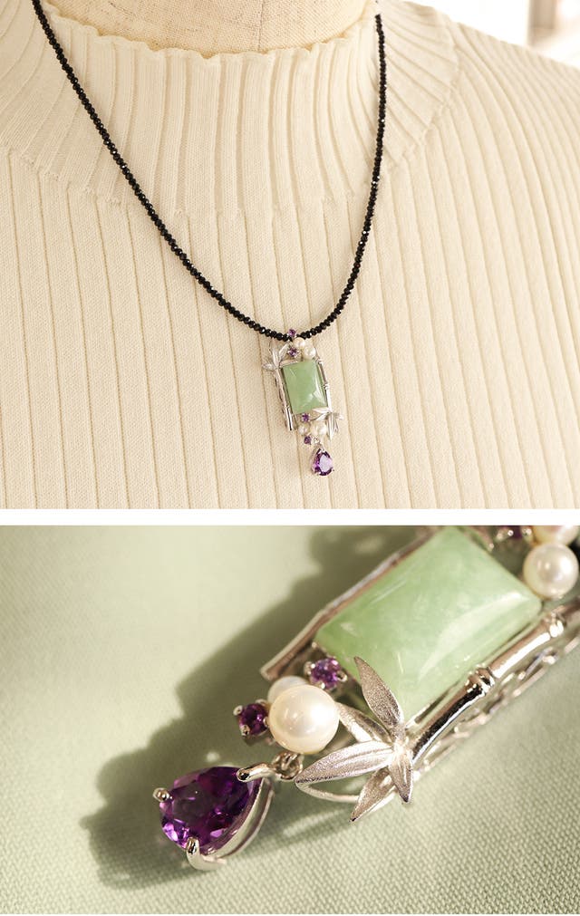 清涼感あふれる翡翠を、竹のモチーフが優しく包み込む、上品なネックレスです。