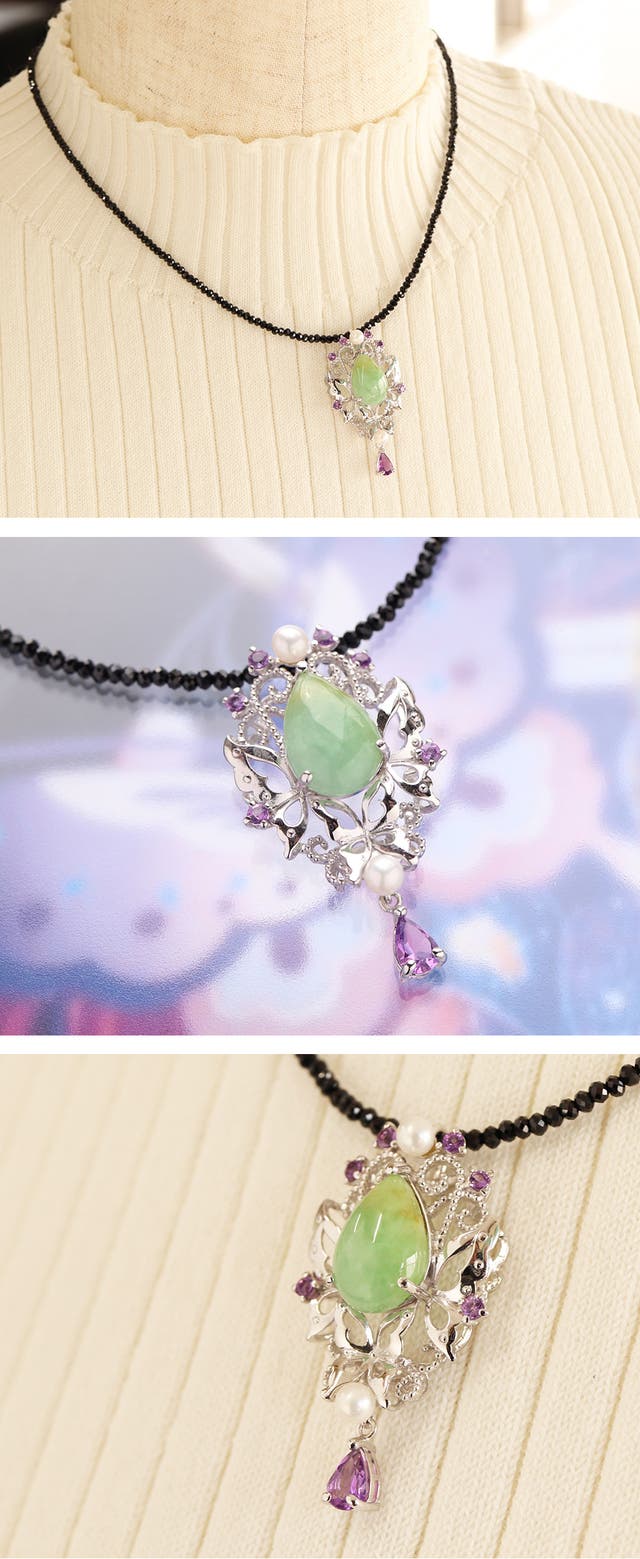 パールの上品な輝きと、アメジストの神秘的な紫色がアクセントとなり、洗練された印象を与えています。胸元で静かに揺れる翡翠と蝶は、まるで物語の一場面を切り取ったかのようです。