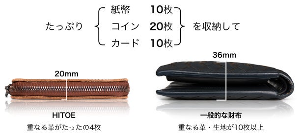 カード、コインが重ならないように並べた「単(ひとえ)構造」により、従来の財布より圧倒的に薄い財布です。紙幣10枚、コイン20枚、カード10枚、こんなにたくさん収納しても、財布の厚さはたったの20mm。 一般的な財布は、何も入っていなくても20mm。圧倒的な薄さです。