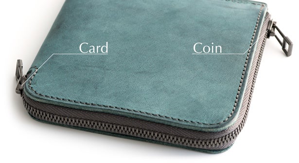 コインポケットが浅いと、カードの出し入れ時にコインを落としてしまわないか心配です。そのため、コイン側とカード側にそれぞれスライダーがある特殊なファスナーを採用しました。カードを使うときはカード側のスライダーを用い、あわててコインをこぼす心配がありません。