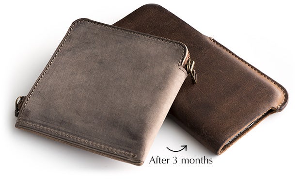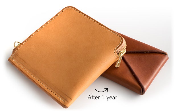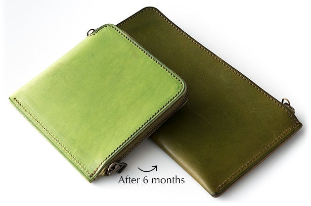 染料で仕上げた革は、使い込むほど色が深まり、エイジングを堪能できます。 エイジングに関しては、ヴァケッタレザーの右に出る革は存在しません。中でもオイルをたっぷり含むエルバマットのエイジングは美しく、短い時間で色艶が深まります。
