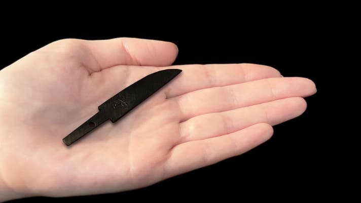 HITOFURIの「御守型ひとふり」は、日本刀と同じく、備前長船の刀鍛冶が玉鋼を素材に制作し、 手作業の限界とも言えるサイズで、刀身の形を再現しました。